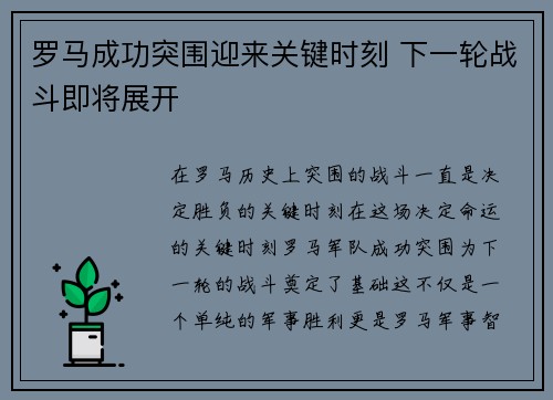 在罗马历史上,突围的战斗一直是决定胜负的关键时刻。在这场决定命运的关键时刻,罗马军队成功突围,为下一轮的战斗奠定了基础。这不仅是一个单纯的军事胜利,更是罗马军事智慧和战略布局的成功体现。随着突围成功,...