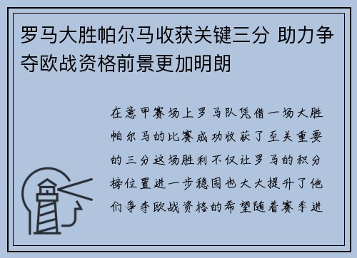 在意甲赛场上,罗马队凭借一场大胜帕尔马的比赛,成功收获了至关重要的三分。这场胜利不仅让罗马的积分榜位置进一步稳固,也大大提升了他们争夺欧战资格的希望。随着赛季进入尾声,每一场比赛的结果都将对欧战资格的...