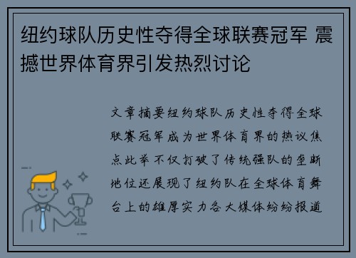 文章摘要:纽约球队历史性夺得全球联赛冠军,成为世界体育界的热议焦点。此举不仅打破了传统强队的垄断地位,还展现了纽约队在全球体育舞台上的雄厚实力。各大媒体纷纷报道这一事件,球迷们在社交媒体上广泛讨论,全...