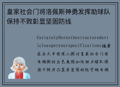 Certainly! Here's the structured article as per your specifications:**摘要:**在本文中,将深入探讨皇家社会门将洛佩斯的出色表现如...