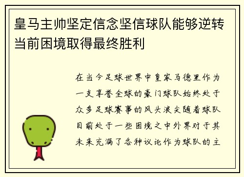 在当今足球世界中,皇家马德里作为一支享誉全球的豪门球队,始终处于众多足球赛事的风头浪尖。随着球队目前处于一些困境之中,外界对于其未来充满了各种议论。作为球队的主帅,如何带领球队走出低谷,重回巅峰,是摆...