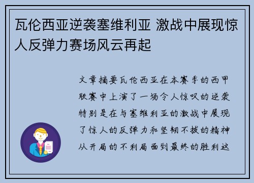 文章摘要:瓦伦西亚在本赛季的西甲联赛中,上演了一场令人惊叹的逆袭,特别是在与塞维利亚的激战中,展现了惊人的反弹力和坚韧不拔的精神。从开局的不利局面到最终的胜利,这场比赛充分展现了瓦伦西亚球队的韧性与团...
