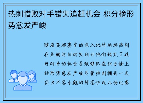 随着英超赛季的深入,托特纳姆热刺在关键时刻的失利让他们错失了追赶对手的机会,导致球队在积分榜上的形势愈发严峻。尽管热刺拥有一支实力不容小觑的阵容,但近几场比赛中的失利暴露了球队在面对强敌时的脆弱。本文...