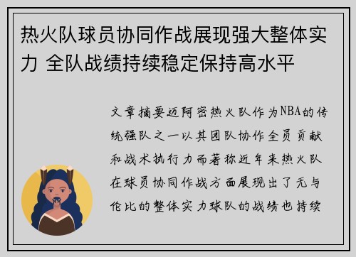 文章摘要:迈阿密热火队,作为NBA的传统强队之一,以其团队协作、全员贡献和战术执行力而著称。近年来,热火队在球员协同作战方面展现出了无与伦比的整体实力,球队的战绩也持续稳定在高水平。本文将从四个方面探...