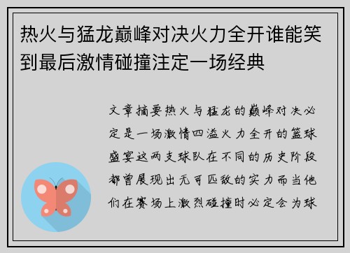 文章摘要:热火与猛龙的巅峰对决,必定是一场激情四溢、火力全开的篮球盛宴。这两支球队在不同的历史阶段都曾展现出无可匹敌的实力,而当他们在赛场上激烈碰撞时,必定会为球迷们带来一场经典之战。本文将从四个方面...
