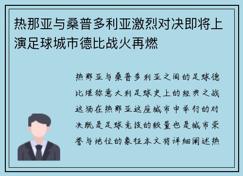 热那亚与桑普多利亚之间的足球德比,堪称意大利足球史上的经典之战。这场在热那亚这座城市中举行的对决,既是足球竞技的较量,也是城市荣誉与地位的象征。本文将详细阐述热那亚与桑普多利亚之间即将上演的激烈对决,...