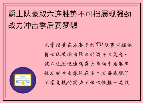 文章摘要:在本赛季的NBA联赛中,犹他爵士队展现出强大的战斗力,凭借一波六连胜,迅速崭露头角,向季后赛席位发起冲击。球队在多个方面展现了不容忽视的实力,不仅仅依赖一名核心球员,而是通过团队协作和多点开...