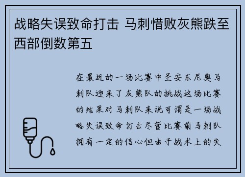 在最近的一场比赛中,圣安东尼奥马刺队迎来了灰熊队的挑战,这场比赛的结果对马刺队来说可谓是一场“战略失误致命打击”。尽管比赛前马刺队拥有一定的信心,但由于战术上的失误,他们最终以微弱差距惜败给灰熊队。这...