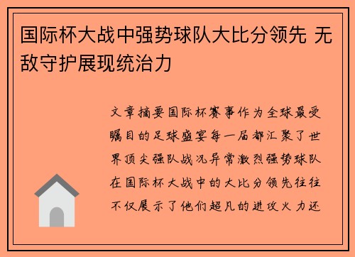 文章摘要:国际杯赛事作为全球最受瞩目的足球盛宴,每一届都汇聚了世界顶尖强队,战况异常激烈。强势球队在国际杯大战中的大比分领先,往往不仅展示了他们超凡的进攻火力,还展现了无敌守护的强大防线。本文将从四个...