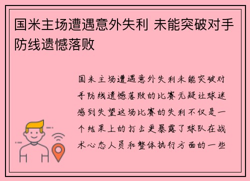 国米主场遭遇意外失利,未能突破对手防线,遗憾落败的比赛无疑让球迷感到失望。这场比赛的失利不仅是一个结果上的打击,更暴露了球队在战术、心态、人员和整体执行方面的一些问题。尽管国米的主场一向是他们的坚实堡...