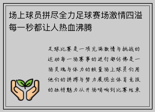 足球比赛是一项充满激情与挑战的运动,每一场赛事的进行都仿佛是一场灵魂与体力的较量。场上球员们用他们的拼搏与努力,展现出体育竞技的独特魅力。从开场哨响到比赛结束,每一个瞬间,每一秒钟都让观众的心跳加速,...