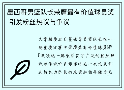 文章摘要:近日,墨西哥男篮队长在一场重要比赛中荣膺最有价值球员(MVP)奖项,这一殊荣引发了广泛的粉丝热议与争议。许多球迷对这一决定表示支持,认为队长的表现和领导能力无可挑剔,理应获得这一荣誉;然而,...