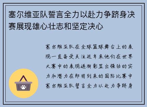 塞尔维亚队在全球篮球舞台上的表现一直备受关注,近年来,他们在世界大赛中的表现逐渐彰显出强劲的实力和潜力。在即将到来的国际比赛中,塞尔维亚队誓言全力以赴,力争跻身决赛,展现出强大的雄心壮志和坚定决心。本...