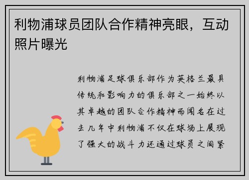 利物浦足球俱乐部,作为英格兰最具传统和影响力的俱乐部之一,始终以其卓越的团队合作精神而闻名。在过去几年中,利物浦不仅在球场上展现了强大的战斗力,还通过球员之间紧密的合作、互动和信任,成就了无数的辉煌时...