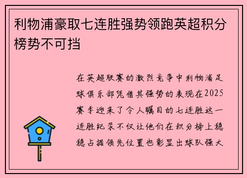 在英超联赛的激烈竞争中,利物浦足球俱乐部凭借其强势的表现,在2025赛季迎来了令人瞩目的七连胜。这一连胜纪录不仅让他们在积分榜上稳稳占据领先位置,也彰显出球队强大的实力和深厚的竞技底蕴。本文将从四个关...