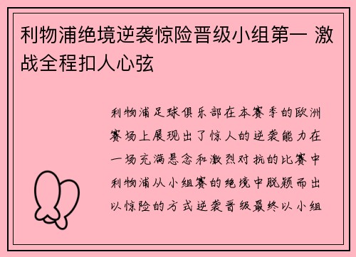 利物浦足球俱乐部,在本赛季的欧洲赛场上展现出了惊人的逆袭能力。在一场充满悬念和激烈对抗的比赛中,利物浦从小组赛的绝境中脱颖而出,以惊险的方式逆袭晋级,最终以小组第一的身份进入淘汰赛阶段。这场比赛不仅让...