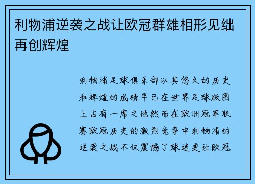 利物浦足球俱乐部,以其悠久的历史和辉煌的成绩,早已在世界足球版图上占有一席之地。然而,在欧洲冠军联赛(欧冠)历史的激烈竞争中,利物浦的逆袭之战,不仅震撼了球迷,更让欧冠的群雄们相形见绌。尤其是他们在2...