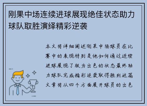 本文将详细阐述刚果中场球员在比赛中的表现,特别是他如何通过连续进球展现了极为出色的状态,最终助力球队完成精彩逆袭,取得胜利。这篇文章将从四个方面展开:球员的出色状态、关键进球的影响、比赛中的关键时刻、...