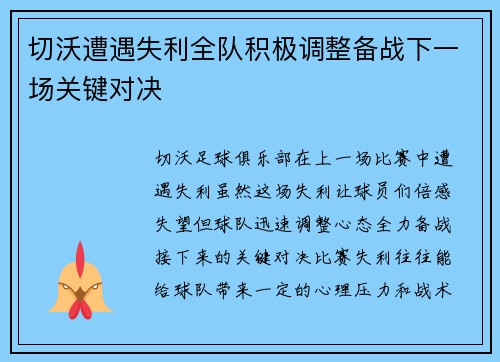 切沃足球俱乐部在上一场比赛中遭遇失利,虽然这场失利让球员们倍感失望,但球队迅速调整心态,全力备战接下来的关键对决。比赛失利往往能给球队带来一定的心理压力和战术反思,但也提供了深刻的学习机会。面对未来的...