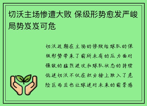 切沃近期在主场的惨败,给球队的保级形势带来了前所未有的压力。面对强敌的猛烈进攻和球队状态的持续低迷,切沃不仅在积分榜上跌入了危险区,而且也让球迷对未来的前景感到深深担忧。本文将从四个方面详细阐述切沃当...