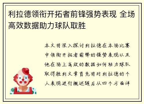 本文将深入探讨利拉德在本场比赛中领衔开拓者前锋的强势表现,以及他在场上高效的数据如何助力球队取得胜利。文章首先将对利拉德的个人表现进行概述,随后从四个方面详细分析他的贡献,包括得分、助攻、防守以及领导...