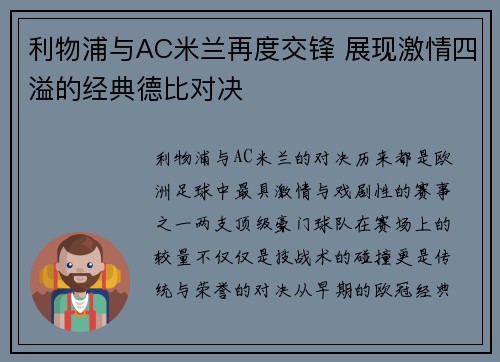 利物浦与AC米兰的对决,历来都是欧洲足球中最具激情与戏剧性的赛事之一。两支顶级豪门球队在赛场上的较量,不仅仅是技战术的碰撞,更是传统与荣誉的对决。从早期的欧冠经典决赛,到近些年的激烈交锋,每一场比赛都...