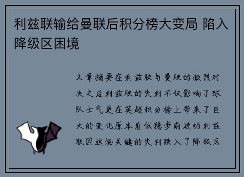 文章摘要:在利兹联与曼联的激烈对决之后,利兹联的失利不仅影响了球队士气,更在英超积分榜上带来了巨大的变化。原本看似稳步前进的利兹联,因这场关键的失利,跌入了降级区的困境。本文将从四个方面详细分析利兹联...