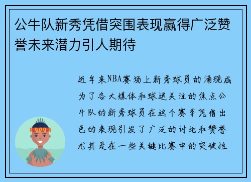 近年来,NBA赛场上新秀球员的涌现成为了各大媒体和球迷关注的焦点。公牛队的新秀球员在这个赛季凭借出色的表现,引发了广泛的讨论和赞誉。尤其是在一些关键比赛中的突破性表现,使得这位新秀迅速赢得了更多的关注...