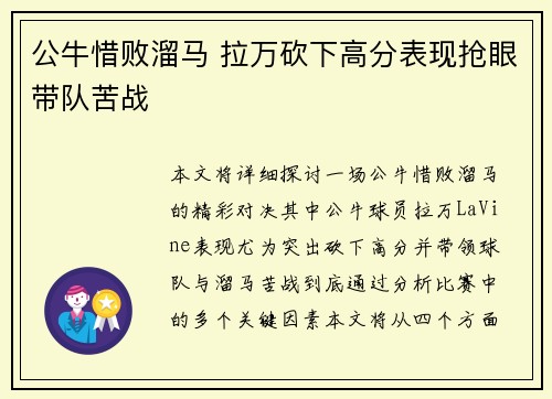 本文将详细探讨一场公牛惜败溜马的精彩对决,其中,公牛球员拉万(LaVine)表现尤为突出,砍下高分并带领球队与溜马苦战到底。通过分析比赛中的多个关键因素,本文将从四个方面深入剖析比赛的精彩瞬间,拉万的...
