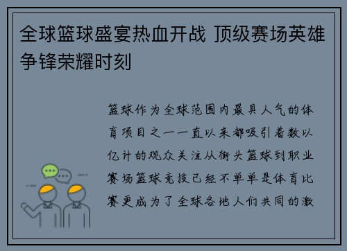 篮球作为全球范围内最具人气的体育项目之一,一直以来都吸引着数以亿计的观众关注。从街头篮球到职业赛场,篮球竞技已经不单单是体育比赛,更成为了全球各地人们共同的激情与梦想。无论是NBA的赛季对决,还是FI...