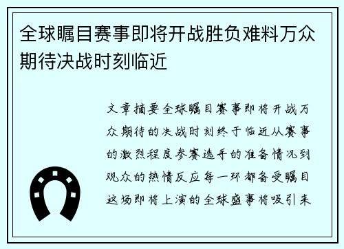 文章摘要:全球瞩目赛事即将开战,万众期待的决战时刻终于临近。从赛事的激烈程度、参赛选手的准备情况到观众的热情反应,每一环都备受瞩目。这场即将上演的全球盛事,将吸引来自世界各地的目光,胜负难以预料,牵动...