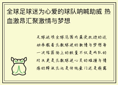 足球,这项全球范围内最受欢迎的运动,承载着无数球迷的激情与梦想。每一次绿茵场上的较量,不仅是两队的对决,更是无数球迷心灵的碰撞与情感的释放。无论是传统豪门还是崭露头角的新兴球队,全球的足球迷都在用自己...