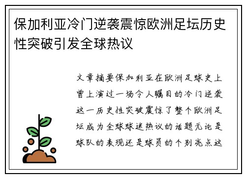文章摘要:保加利亚在欧洲足球史上曾上演过一场令人瞩目的冷门逆袭,这一历史性突破震惊了整个欧洲足坛,成为全球球迷热议的话题。无论是球队的表现,还是球员的个别亮点,这一突破的背后都充满了戏剧性和传奇色彩。...