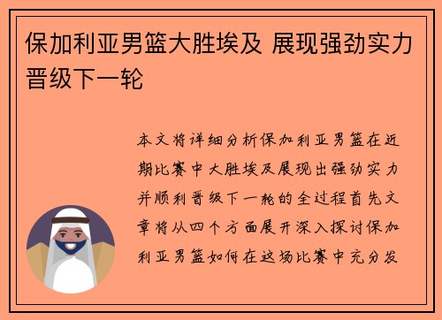 本文将详细分析保加利亚男篮在近期比赛中大胜埃及,展现出强劲实力并顺利晋级下一轮的全过程。首先,文章将从四个方面展开,深入探讨保加利亚男篮如何在这场比赛中充分发挥自己的优势,展现出令人瞩目的表现。第一方...