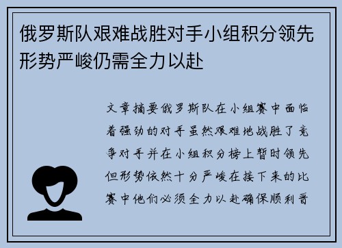 文章摘要:俄罗斯队在小组赛中面临着强劲的对手,虽然艰难地战胜了竞争对手并在小组积分榜上暂时领先,但形势依然十分严峻。在接下来的比赛中,他们必须全力以赴,确保顺利晋级。本文将从四个方面对俄罗斯队的现状进...