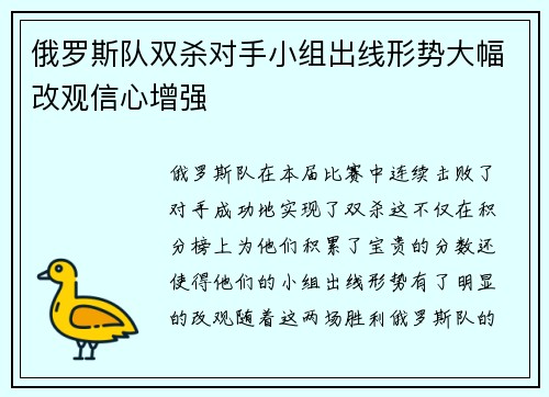 俄罗斯队在本届比赛中连续击败了对手,成功地实现了“双杀”,这不仅在积分榜上为他们积累了宝贵的分数,还使得他们的小组出线形势有了明显的改观。随着这两场胜利,俄罗斯队的信心大幅提升,球员的士气高涨,整个团...