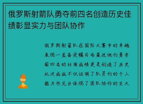 俄罗斯射箭队在国际大赛中的卓越表现一直备受瞩目,而最近他们勇夺前四名的壮丽成绩更是创造了历史。此次成就不仅证明了队员们的个人能力,也充分体现了团队协作的巨大力量。从精湛的射箭技术,到高效的战略布置,再...