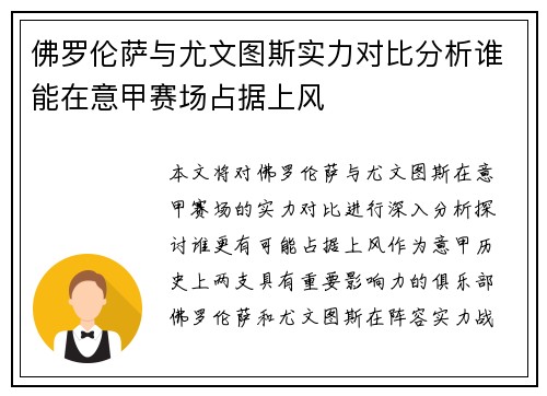 本文将对佛罗伦萨与尤文图斯在意甲赛场的实力对比进行深入分析,探讨谁更有可能占据上风。作为意甲历史上两支具有重要影响力的俱乐部,佛罗伦萨和尤文图斯在阵容实力、战术体系、俱乐部历史以及球队稳定性等方面存在...