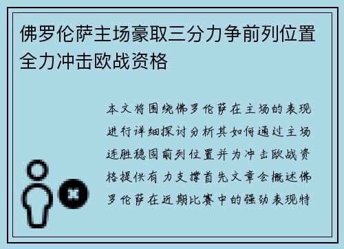 本文将围绕佛罗伦萨在主场的表现进行详细探讨,分析其如何通过主场连胜稳固前列位置,并为冲击欧战资格提供有力支撑。首先,文章会概述佛罗伦萨在近期比赛中的强劲表现,特别是在主场赢得关键三分的重要性。接着,我...