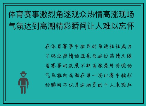 在体育赛事中,激烈的角逐往往成为了观众热情的源泉,而这份热情又随着赛事的发展不断高涨,最终将现场气氛推向高潮。在每一场比赛中,精彩的瞬间不仅是运动员的个人表现和团队协作的体现,更是整个赛事的灵魂所在。...