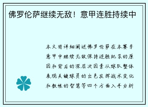 本文将详细阐述佛罗伦萨在本赛季意甲中继续无敌,保持连胜纪录的原因和背后的深层次因素。从球队整体表现、关键球员的出色发挥、战术变化和教练的智慧等四个方面入手,分析佛罗伦萨如何在强敌环伺的意甲联赛中脱颖而...