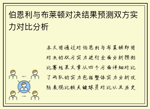 本文将通过对伯恩利与布莱顿即将对决的双方实力进行全面分析,预测比赛结果。文章从四个方面详细对比了两队的实力,包括:整体实力分析、攻防表现比较、关键球员对比以及历史对阵数据分析。通过这些维度的深入剖析,...