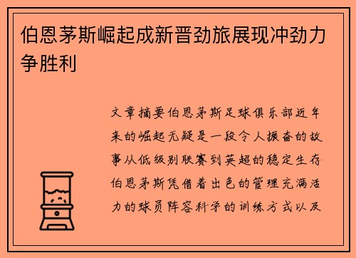 文章摘要:伯恩茅斯足球俱乐部近年来的崛起无疑是一段令人振奋的故事。从低级别联赛到英超的稳定生存,伯恩茅斯凭借着出色的管理、充满活力的球员阵容、科学的训练方式以及教练组的智慧和决策,逐步跻身英格兰足球的...