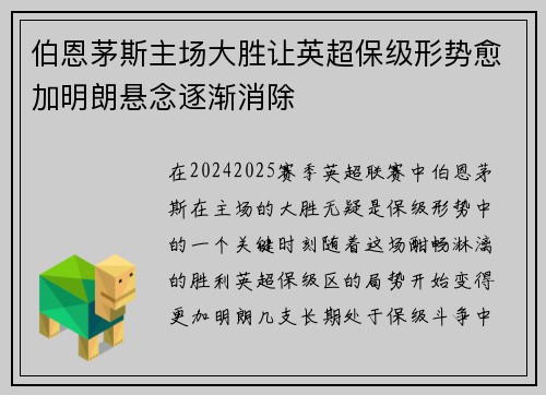 在2024-2025赛季英超联赛中,伯恩茅斯在主场的大胜无疑是保级形势中的一个关键时刻。随着这场酣畅淋漓的胜利,英超保级区的局势开始变得更加明朗,几支长期处于保级斗争中的球队也因此感受到了更大的压力。...