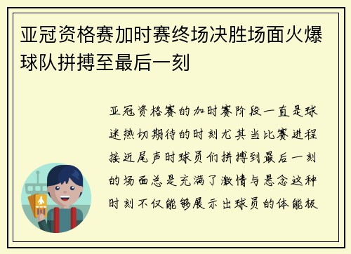 亚冠资格赛的加时赛阶段,一直是球迷热切期待的时刻,尤其当比赛进程接近尾声时,球员们拼搏到最后一刻的场面总是充满了激情与悬念。这种时刻不仅能够展示出球员的体能极限,更能彰显他们的意志力和团队合作精神。在...