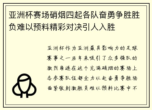 亚洲杯作为亚洲最具影响力的足球赛事之一,历年来吸引了众多强队的激烈角逐。在这个充满硝烟的赛场上,各参赛队伍都全力以赴,奋勇争胜,场面紧张刺激,胜负难以预料。比赛中,不仅有顶级球员的精湛技艺展示,还有战...