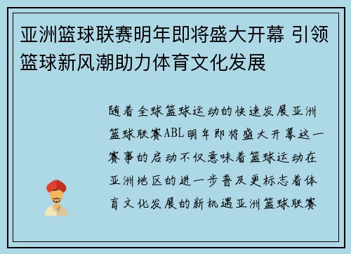 随着全球篮球运动的快速发展,亚洲篮球联赛(ABL)明年即将盛大开幕。这一赛事的启动不仅意味着篮球运动在亚洲地区的进一步普及,更标志着体育文化发展的新机遇。亚洲篮球联赛的开幕无疑将引领篮球新风潮,推动体...