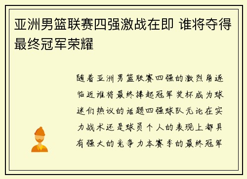 随着亚洲男篮联赛四强的激烈角逐临近,谁将最终捧起冠军奖杯,成为球迷们热议的话题。四强球队无论在实力、战术,还是球员个人的表现上,都具有强大的竞争力,本赛季的最终冠军争夺战势必将成为一场精彩纷呈的篮球盛...