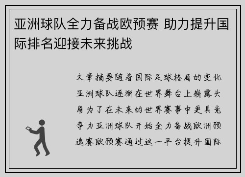文章摘要:随着国际足球格局的变化,亚洲球队逐渐在世界舞台上崭露头角。为了在未来的世界赛事中更具竞争力,亚洲球队开始全力备战欧洲预选赛(欧预赛),通过这一平台提升国际排名,并为未来的挑战奠定坚实基础。本...