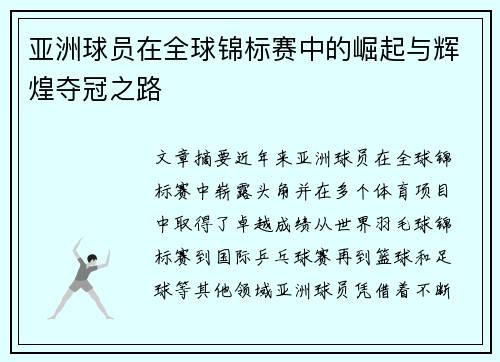 文章摘要:近年来,亚洲球员在全球锦标赛中崭露头角,并在多个体育项目中取得了卓越成绩。从世界羽毛球锦标赛到国际乒乓球赛,再到篮球和足球等其他领域,亚洲球员凭借着不断的努力、过硬的技术和强大的心理素质,逐...